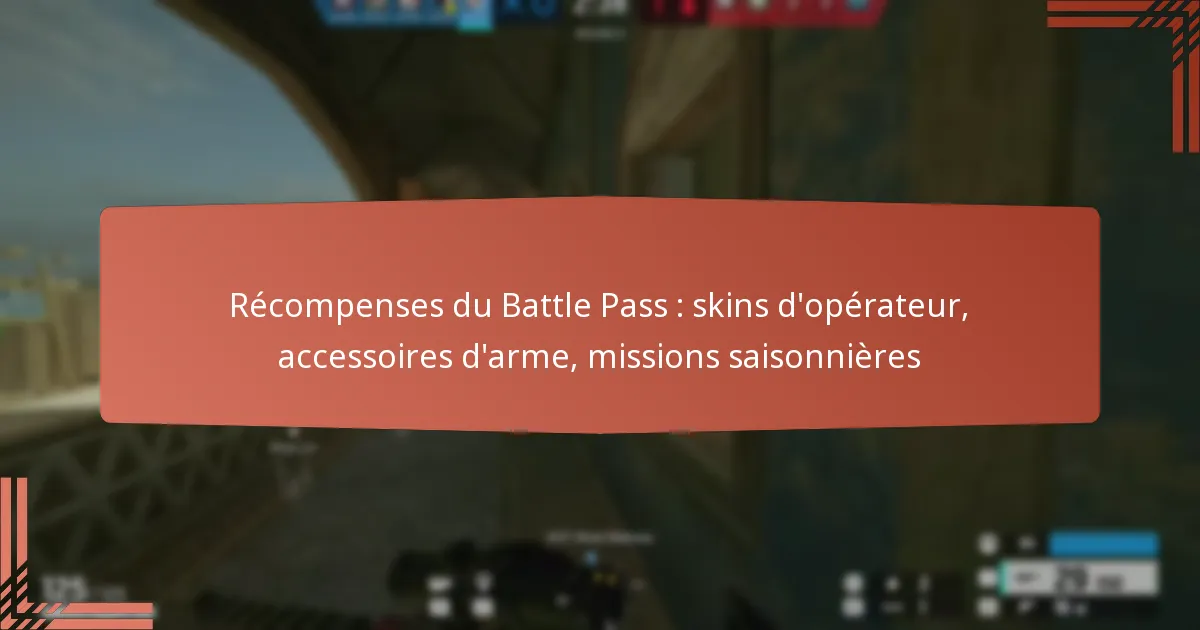 Les récompenses du Battle Pass dans Tom Clancy’s Rainbow Six Siege offrent aux joueurs des objets et des améliorations exclusifs au fur et à mesure qu’ils progressent dans le Battle Pass saisonnier. Ces récompenses incluent des skins d’Opérateur uniques qui permettent une expression personnelle, des accessoires d’arme qui améliorent les performances et la personnalisation, ainsi que des missions saisonnières qui enrichissent l’expérience de jeu globale.